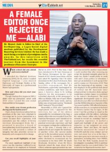 The most significant highlight of my career was the rejection I suffered in my first attempt to be employed at National Mirror in 2010. Prior to this time, I had been introduced to Mr Sam Omatseye at The Nation Newspaper by the Lagos branch of OAU alumni association, who in turn asked Mr Ogundipe that I be taken downstairs to Mr Lekan Otufodunrin, then Sunday editor of the newspaper, for a possible engagement. But Mr Otufodunrin, apparently handicapped by certain conditions, said there was no space. I, however, chose to be writing features for the newspaper to be submitted physically at the newspaper’s office in Mushin. Only one of such efforts got published after many weeks, and my byline was erroneously used as “Moshood Alabi” instead of “Mojeed Alabi”.