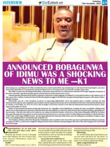 The Onidimu of Idimu, Oba Noah Olayiwola Adefimihan, who ascended to the stool of his ancestors and had his installation ceremony on August 24 2025, is said to have caught K1 off guard in his choice of him for that prestigious title. How? How did it happen? K1 told Tunde Busari. Excerpts