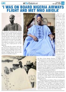 He recollects, “I met Awolowo in his house at Apapa. I got to know him through my father-in-law who was one of his close friends. It was a case on a property which facilitated our first meeting. I also met MKO Abiola in a flight to London. It was Nigerian Airway. I saw him rising up from his seat and walked straight to him and stretched my hand to him. And we greeted each other and alighted. We later met at a different occasion. Also, Chief Rotimi Williams served as my lawyer during his lifetime.”