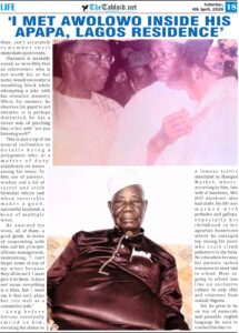 Recollecting his contact with late Mrs Awolowo, Oladunnu reveals, “She had her shops at Balogun West while I was at Balogun East. She used to come around visiting shops and we also always accorded her respect.”